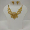 This elegant set features a gold-plated necklace and matching earrings, designed to mimic the opulence of genuine gold jewelry. The necklace showcases intricate patterns and delicate detailing, reminiscent of traditional motifs. Its adjustable chain ensures a comfortable fit, allowing you to customize the length to complement your neckline.