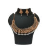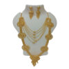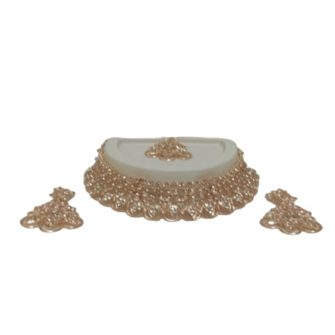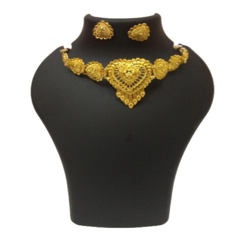 This elegant set features a gold-plated necklace and matching earrings, designed to mimic the opulence of genuine gold jewelry. The necklace showcases intricate patterns and delicate detailing, reminiscent of traditional motifs. Its adjustable chain ensures a comfortable fit, allowing you to customize the length to complement your neckline.