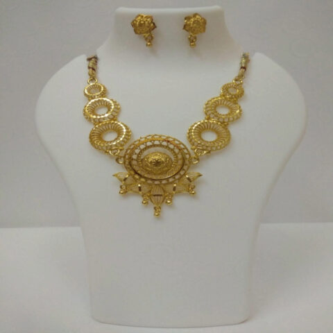 This elegant set features a gold-plated necklace and matching earrings, designed to mimic the opulence of genuine gold jewelry. The necklace showcases intricate patterns and delicate detailing, reminiscent of traditional motifs. Its adjustable chain ensures a comfortable fit, allowing you to customize the length to complement your neckline.